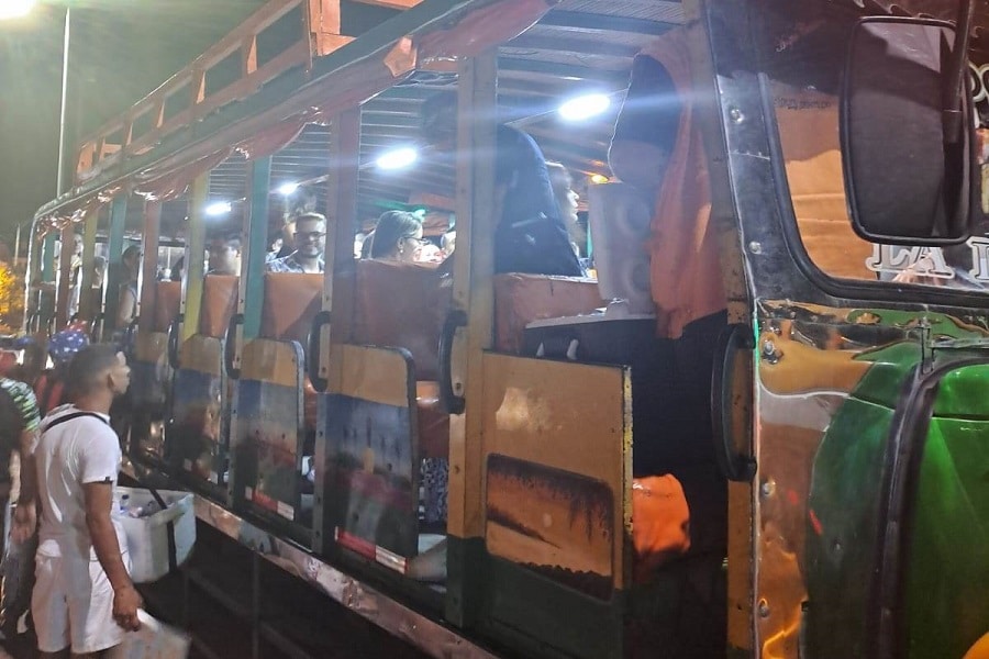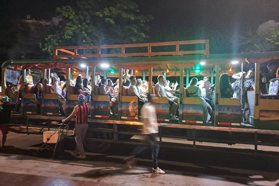 Aquí los viajeros pueden bajar de la chiva, bailar al ritmo de la música en vivo, tomarse fotografías y comenzar a sentir la esencia festiva de Cartagena bajo el cielo nocturno.